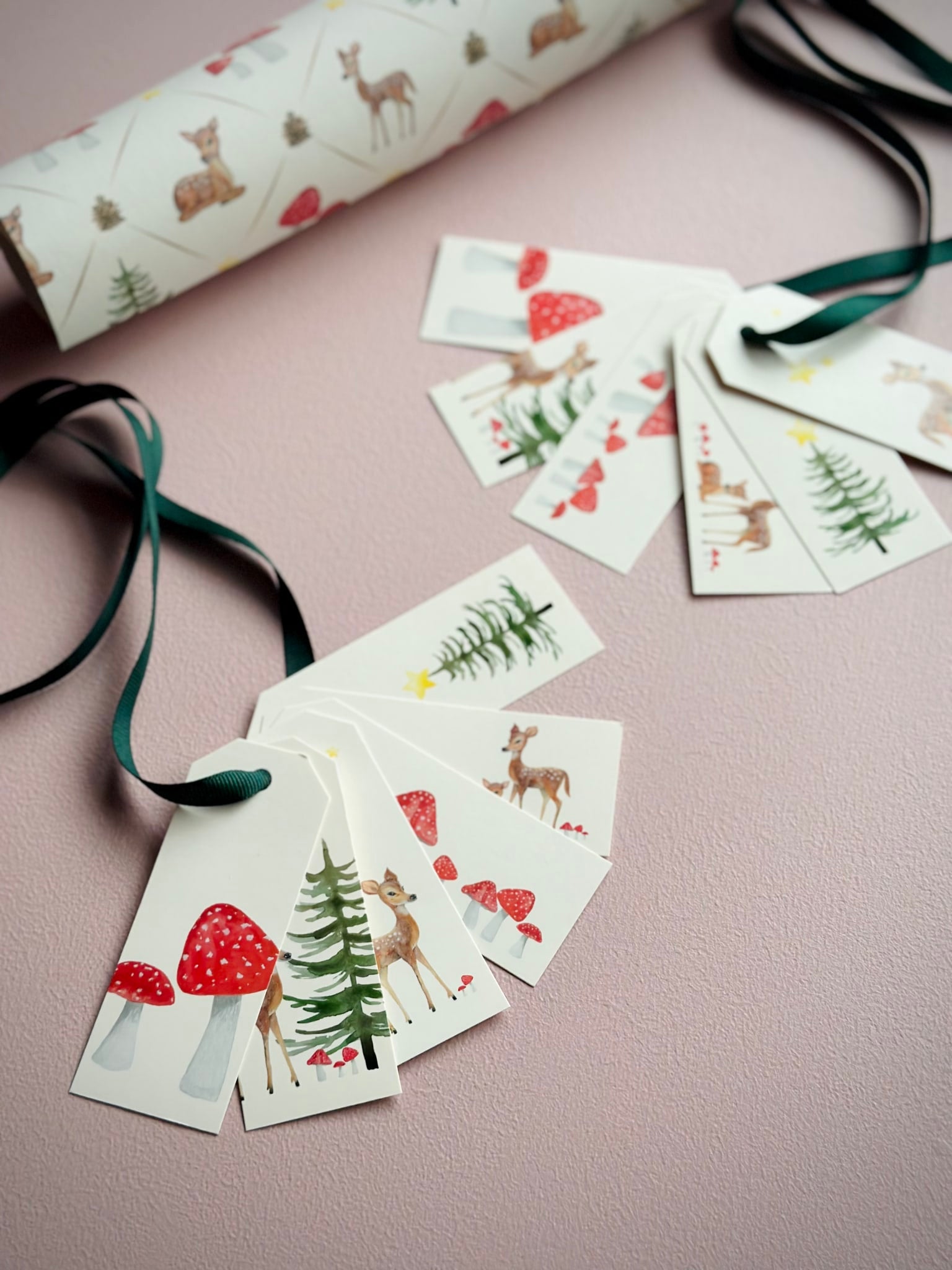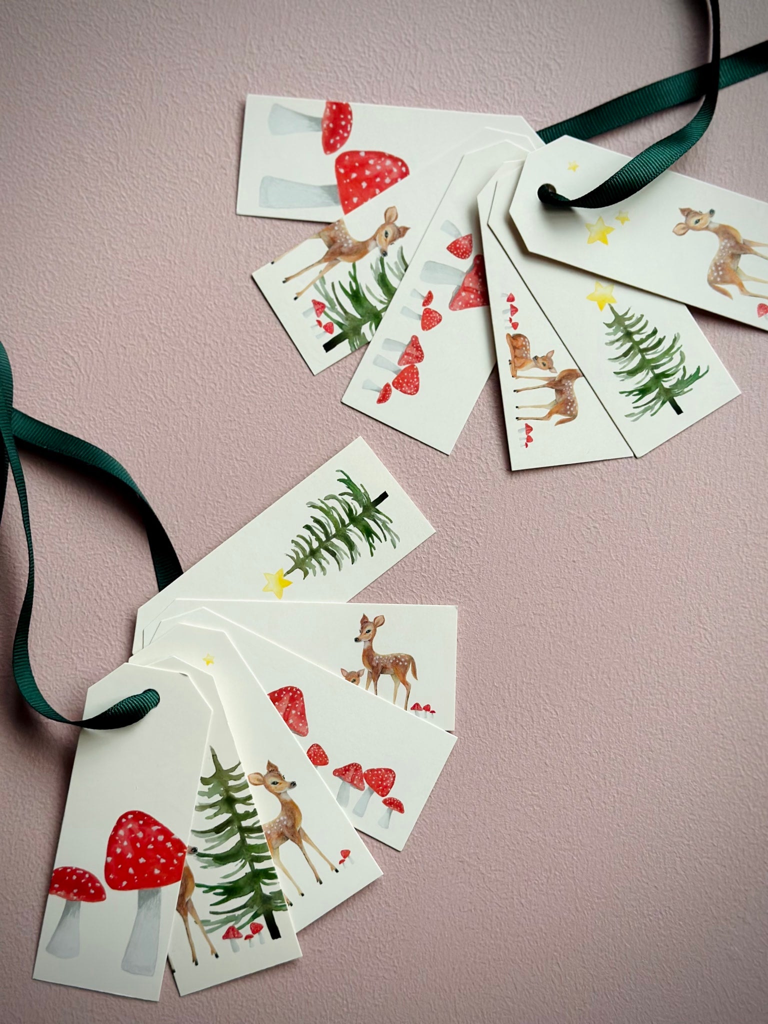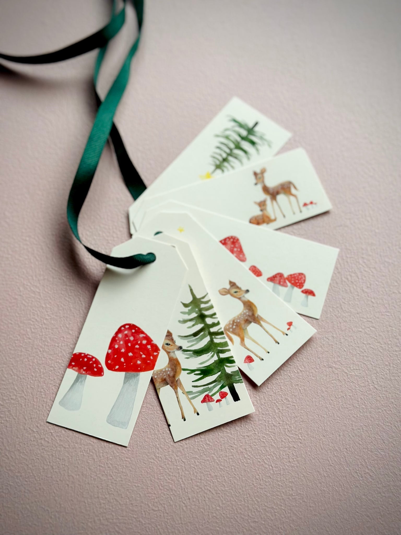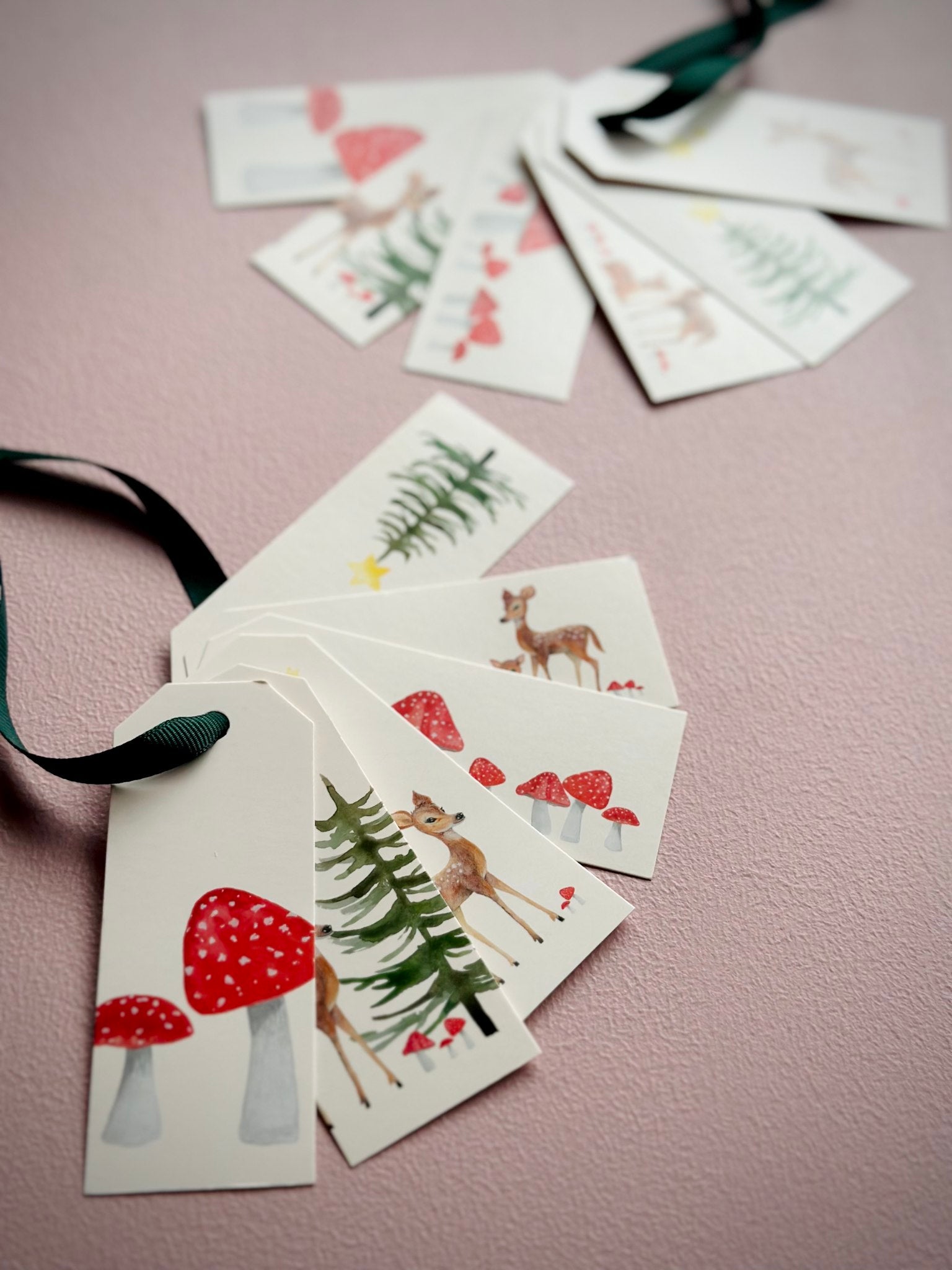 Gavemærkerne har glat, blank overflade på forsiden og er matte på bagsiden i postkort karton, så de er nemme at skrive på.