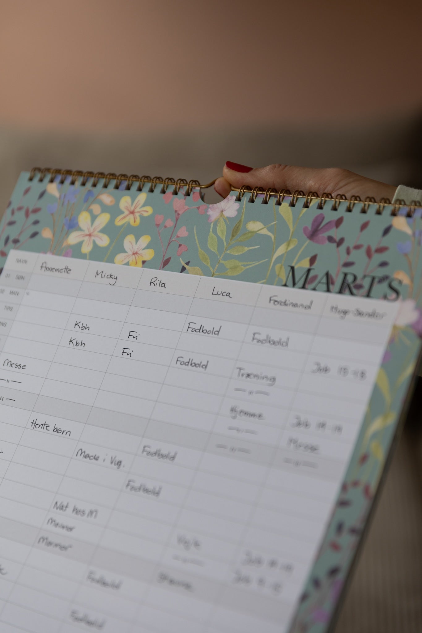 Hver måned er opdelt i 6 kolonner, så hvert familiemedlem (eller person i kollektivet) har sin helt egen kolonne til hver dag. Det gør det rigtig nemt at holde et visuelt overblik over hele familiens aktiviteter, - så man i sidste ende når det hele.