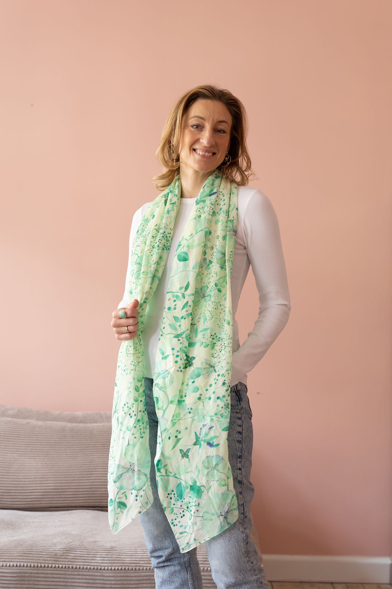 Botanic Lavender Tørklædet i 100% bomuld består af det smukkeste farvemiks af grønne nuancer på varm cremefarvet bund. Tørklædet er super anvendeligt og elegant.