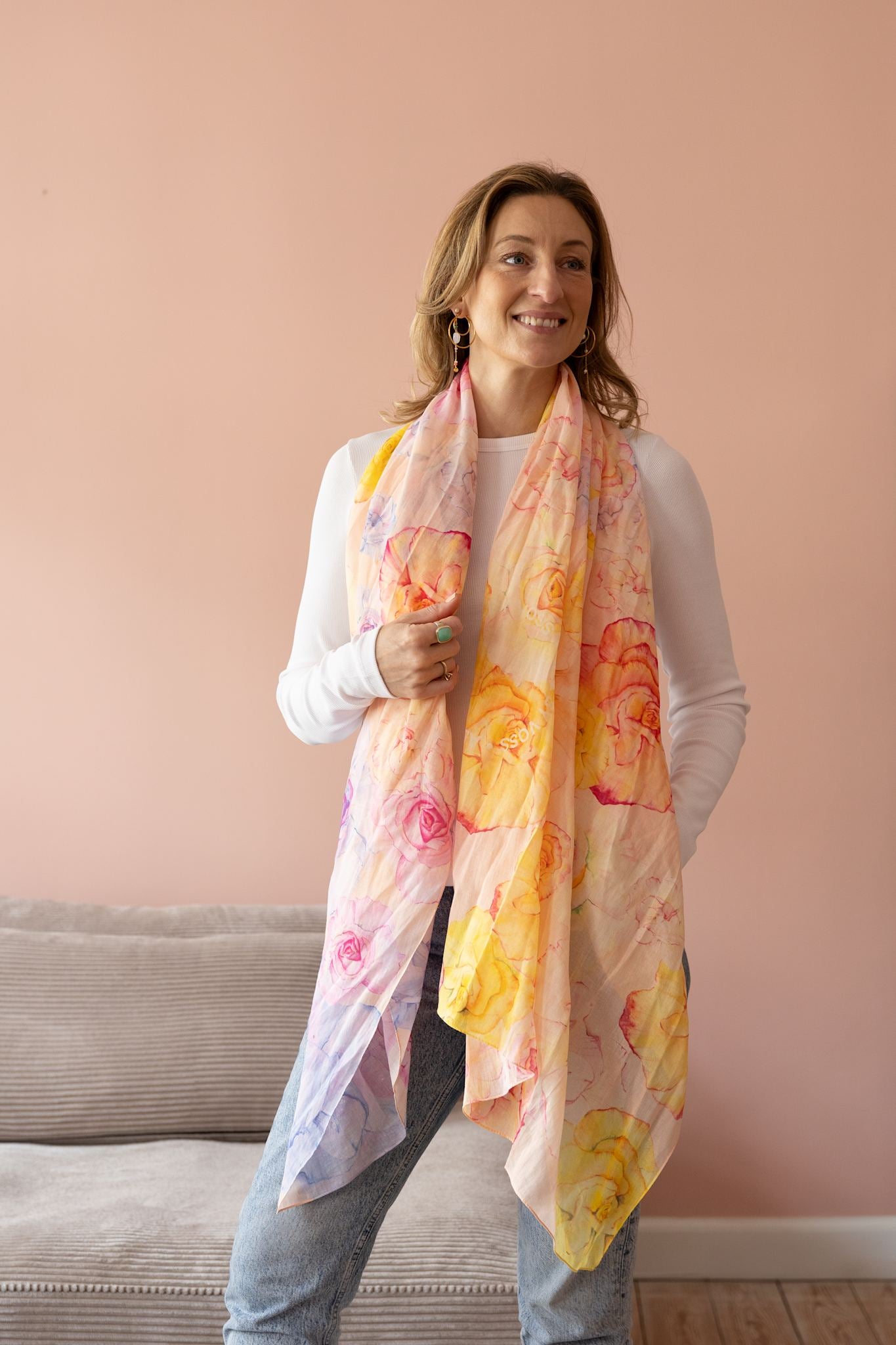 Rose FieldTørklædet i 100% bomuld består af det smukkeste farvemiks af rosa, lilla, gul, orange og pink på ferskenfarvet bund. Tørklædet er super anvendeligt og elegant.