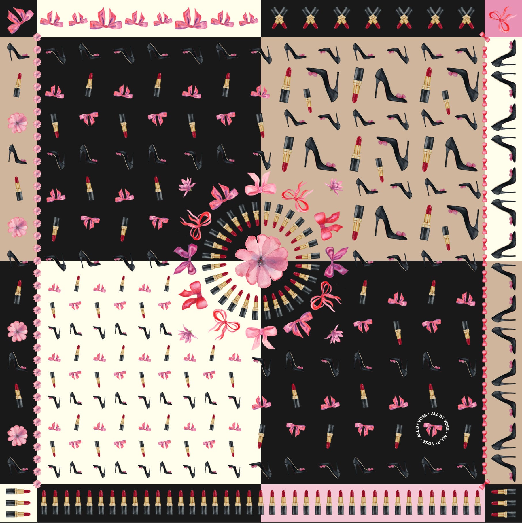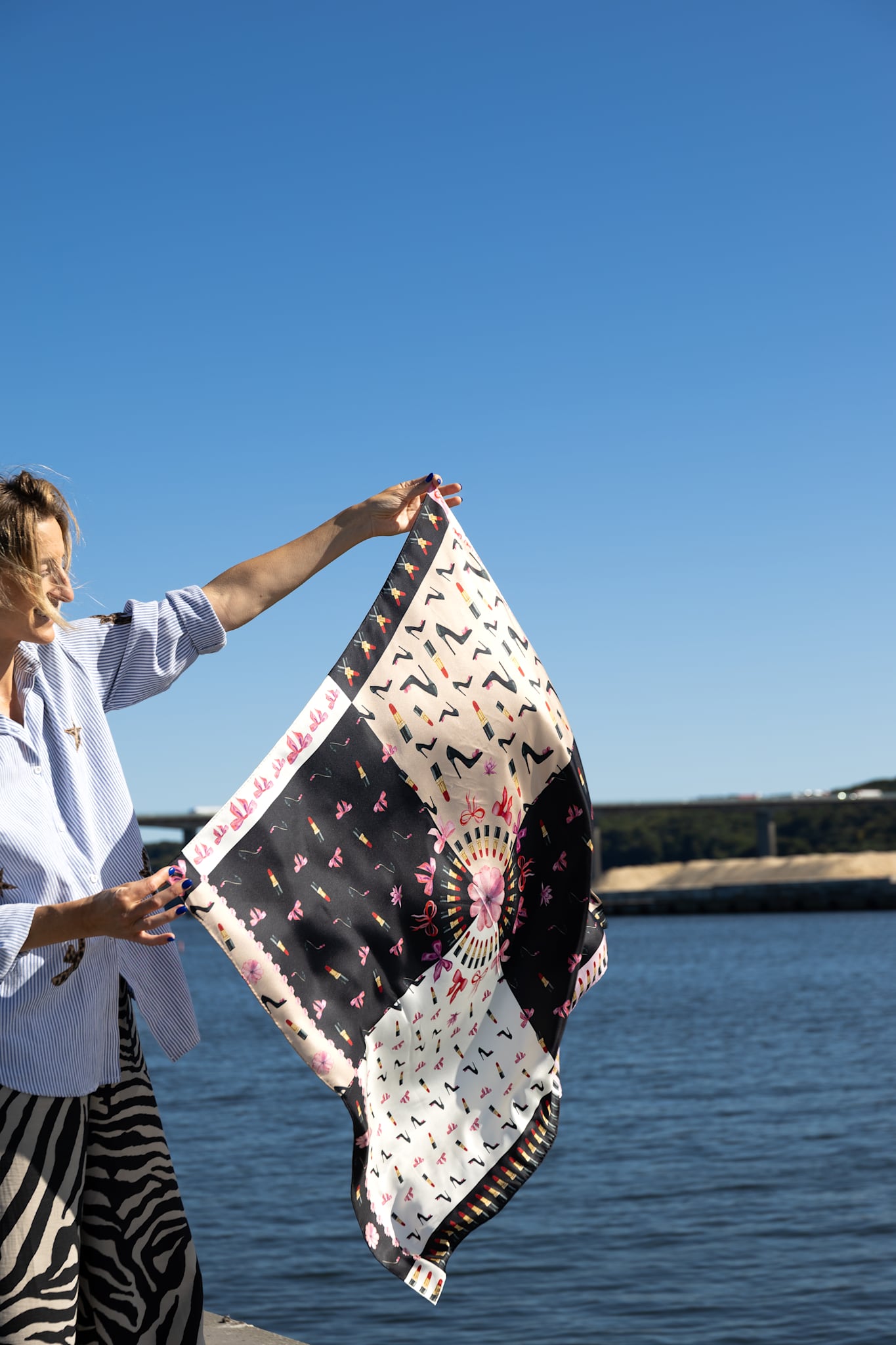 Tørklædet består af det smukkeste farvemiks af creme, beige, lyserøde og sort/hvide detaljer. Tørklædet er super anvendeligt og elegant.