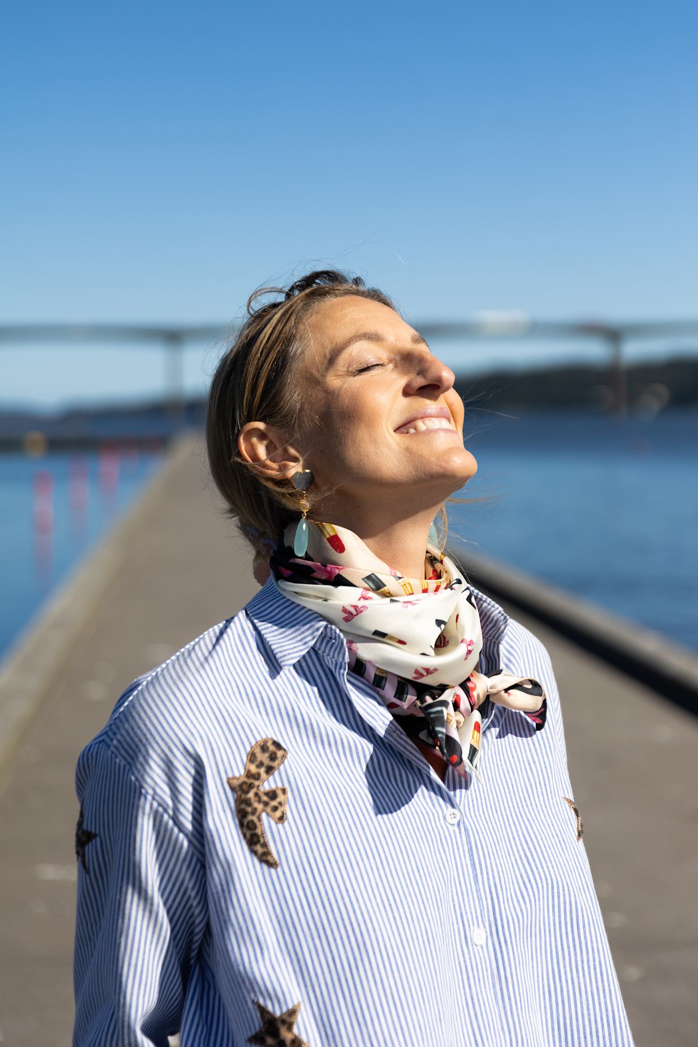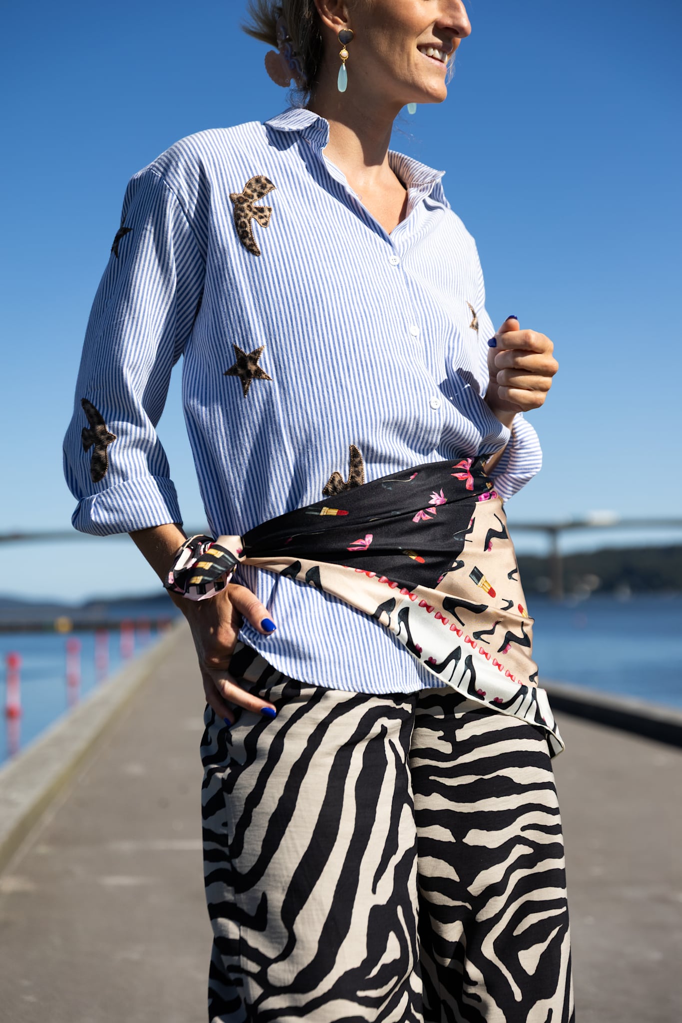 Størrelsen egner sig perfekt som et tørklæde i halsen eller hvor det kan vikles rundt et par gange eller som hårpynt. Brug også dit tørklæde som pynt på din håndtaske for at give et personligt look.