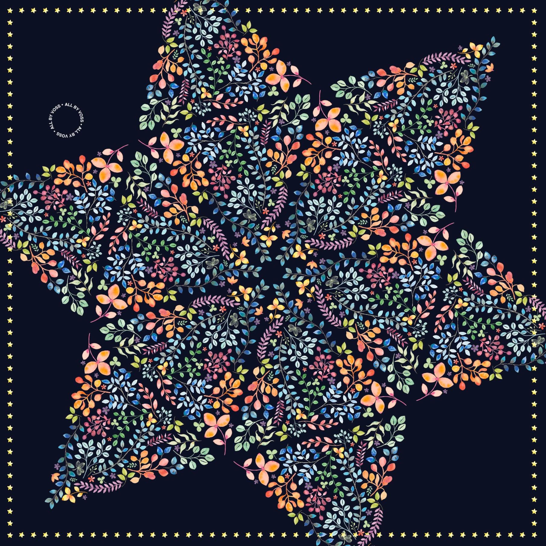 Tørklædet består af det smukkeste farvemiks af lavendel, lilla, orange, pink , røde, blå og gule nuancer på mørkeblå bund. Tørklædet er super anvendeligt og elegant både sommer og vinter.