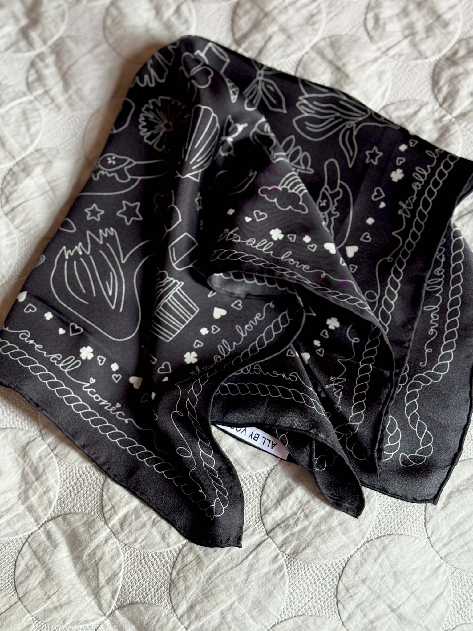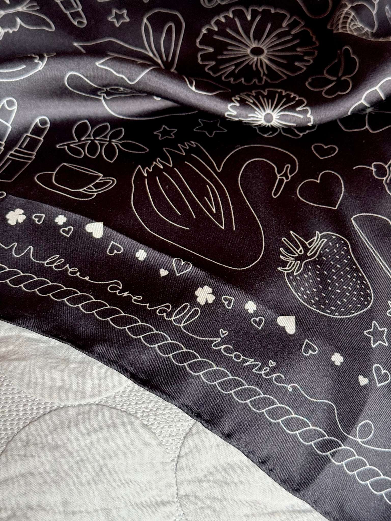 Tørklædet består af stærkt grafisk mønster bestående af søde og humoristiske ikoner, tegnet op digitalt, med udgangspunkt i nogle af ALL BY VOSS' mest anvendte akvarelillustrationer.