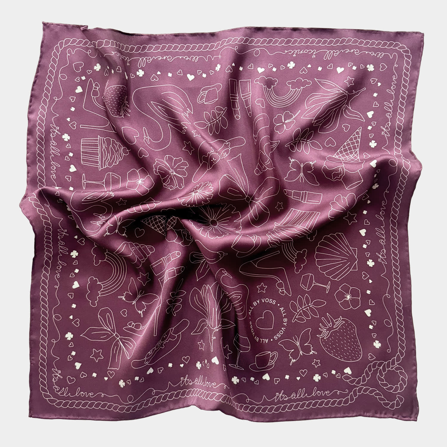 Tørklædet består af stærkt grafisk mønster bestående af søde og humoristiske ikoner, tegnet op digitalt, med udgangspunkt i nogle af ALL BY VOSS' mest anvendte akvarelillustrationer.