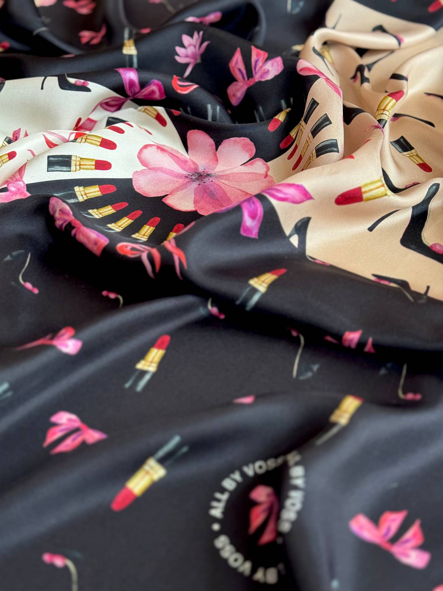 Langs kanten er silken rullet og håndsyet, hvilket giver et ekslusivt udtryk og en flot afslutning. Denne detalje er også med til at komplimentere de håndmalede akvareller, der er trykt på silken, og løfter tørklædet til et højt æstetisk niveau.